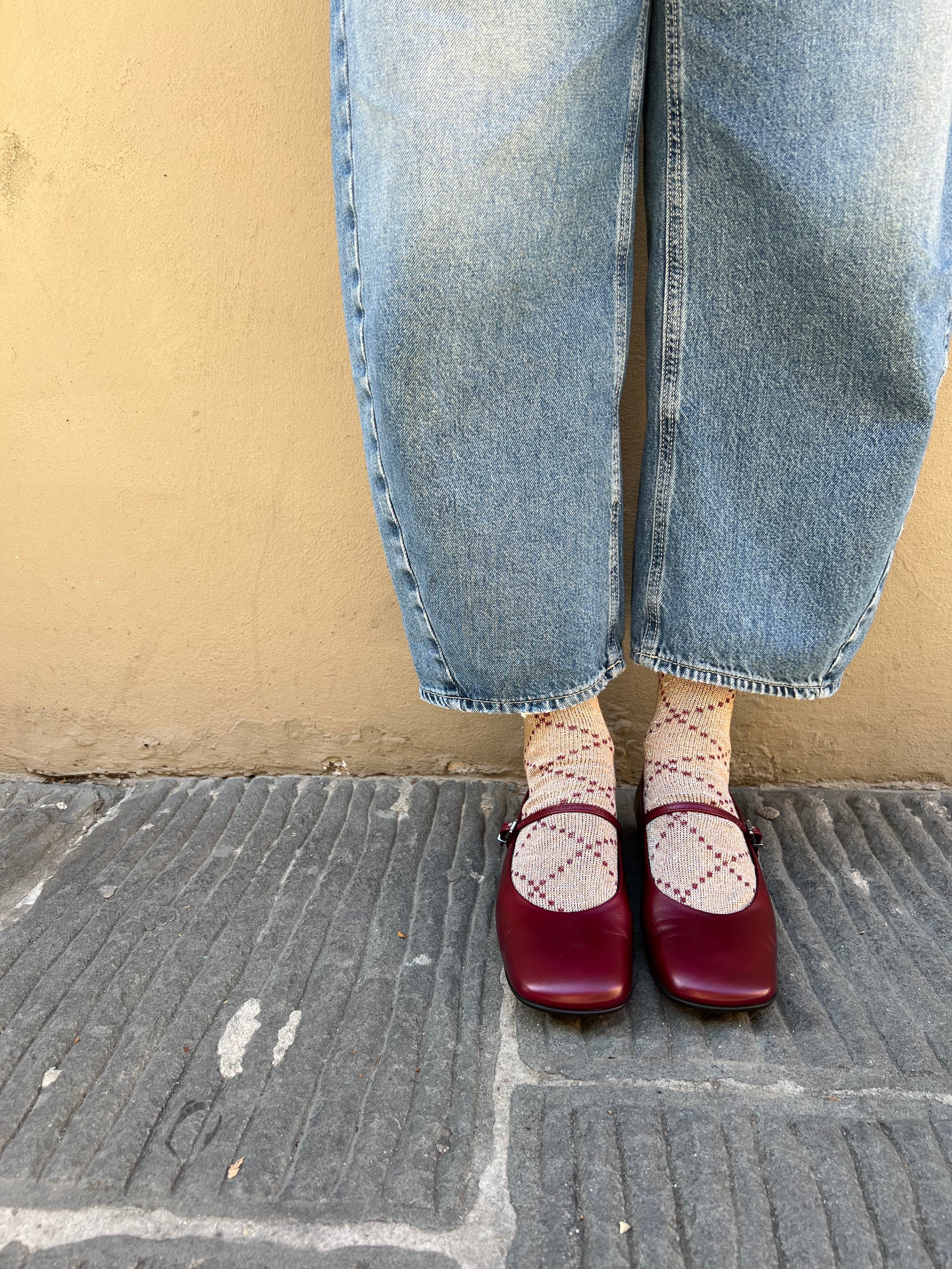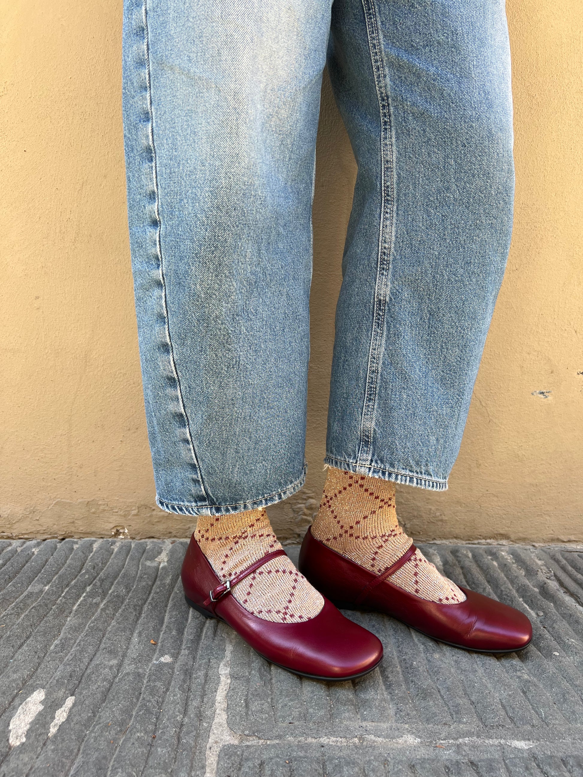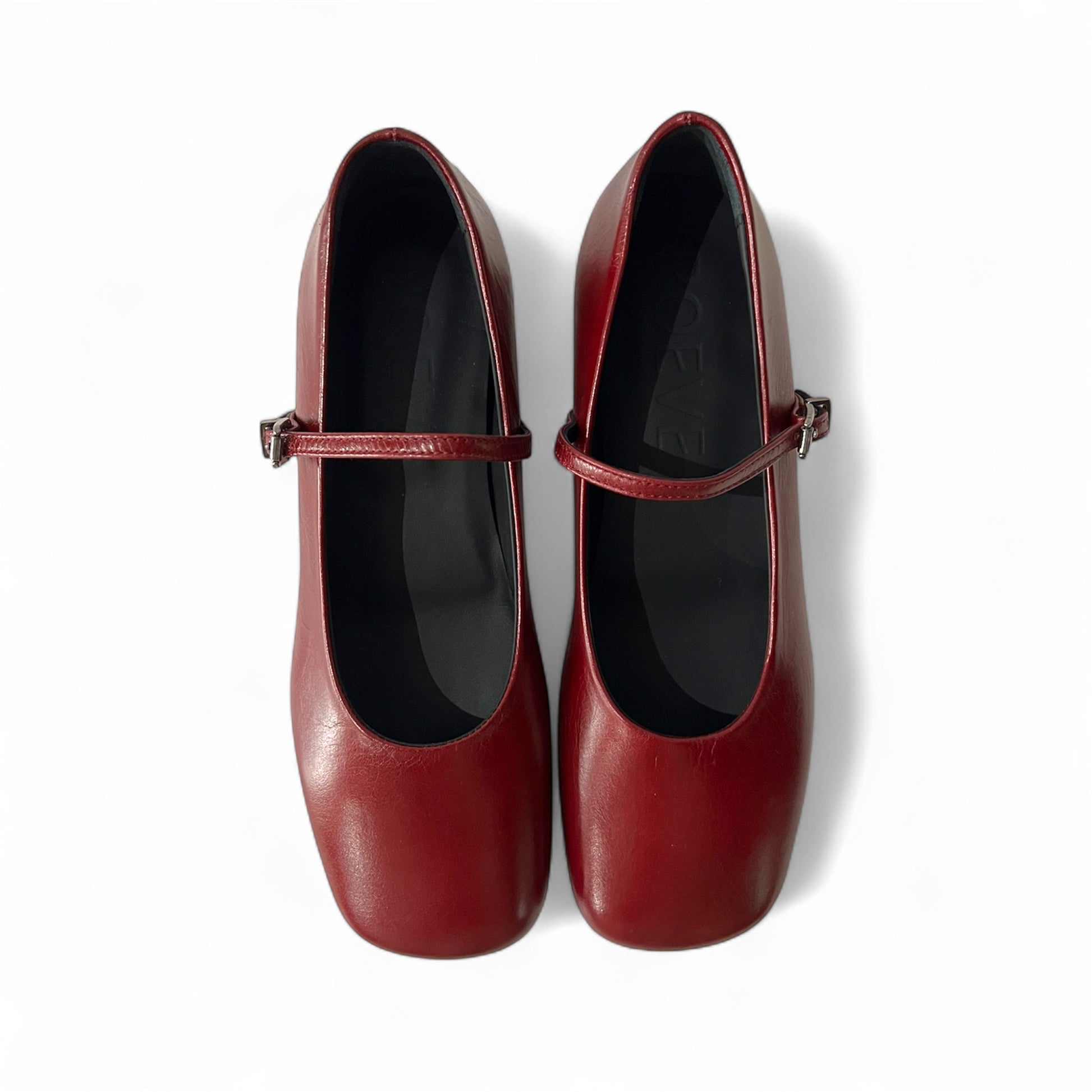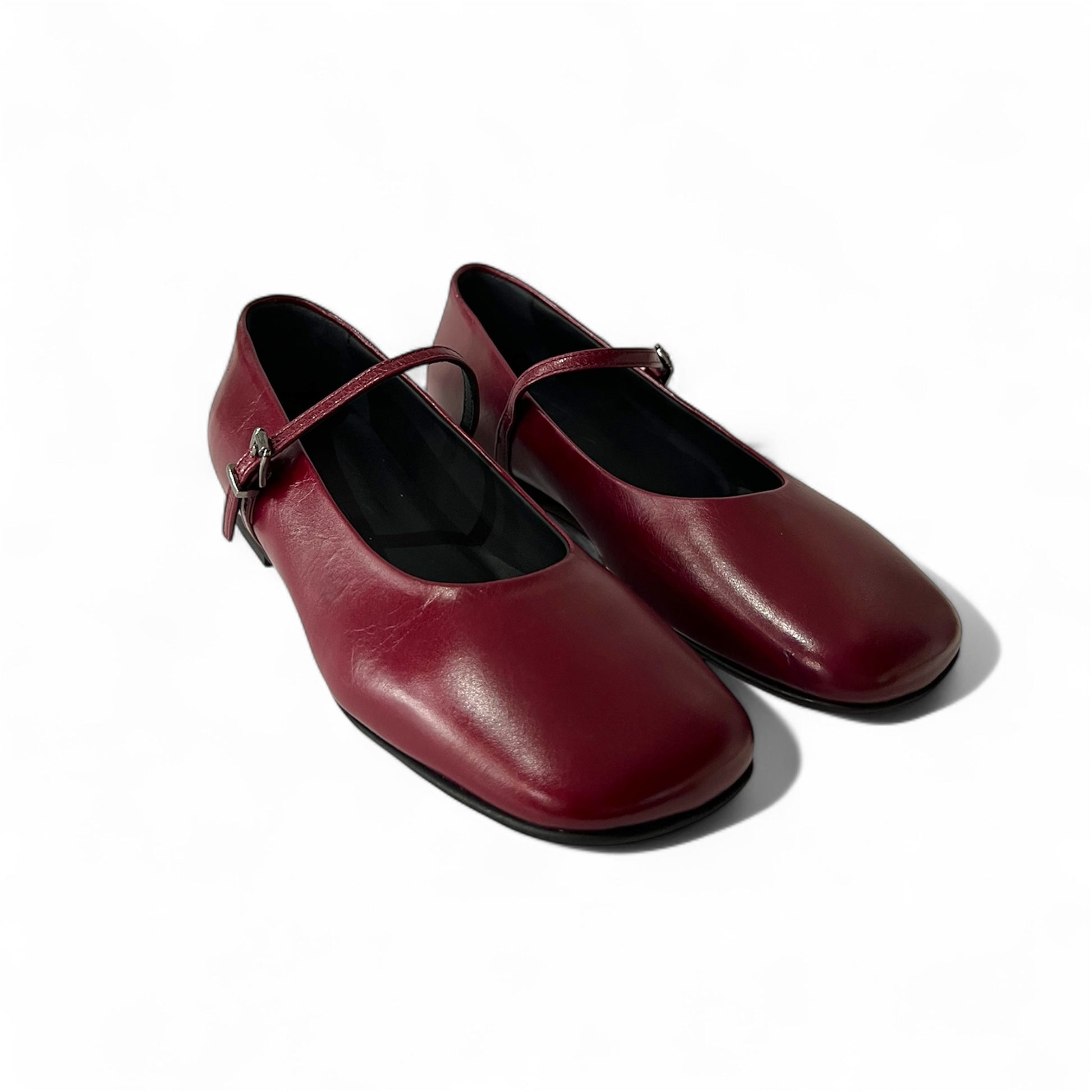 Ballerine in pelle color rubino con cinturino e fibbia in metallo.